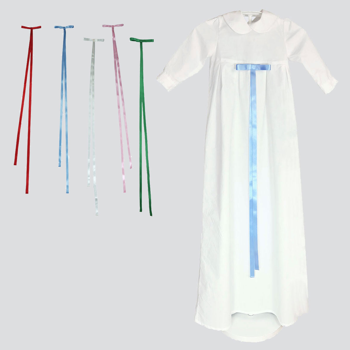 Färg: Dopklänningen är klarvit. Ett smalt band följer med, välj färg: creme, rosa, blå, röd eller grön. Bredare doprosett med band finns att köpa till i färgerna kungsblå, gammalrosa eller creme.