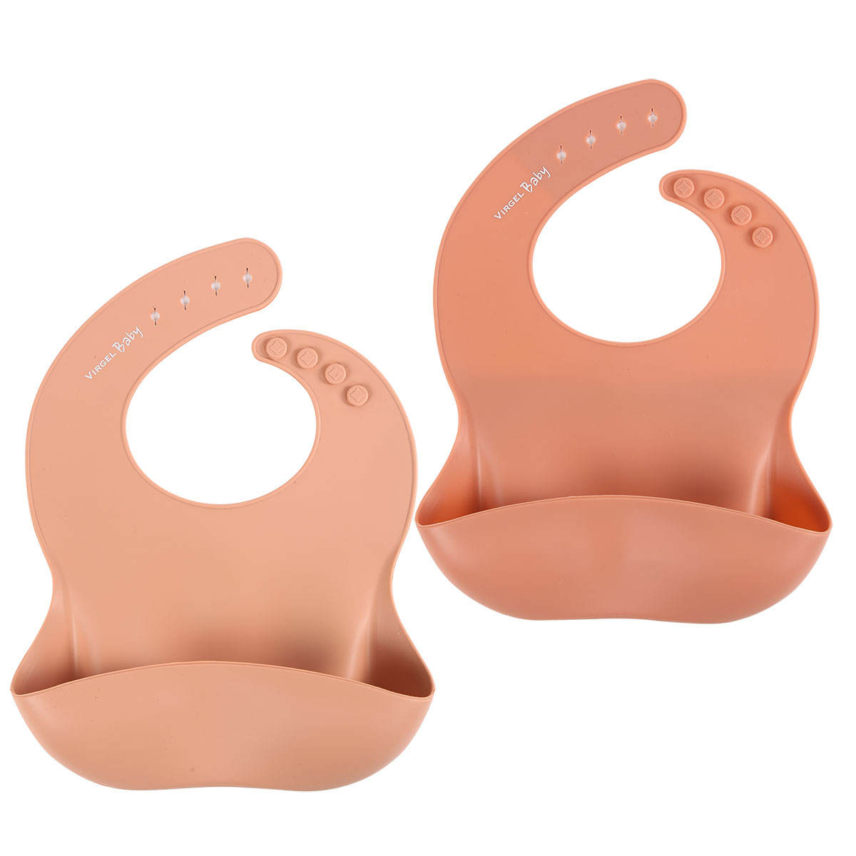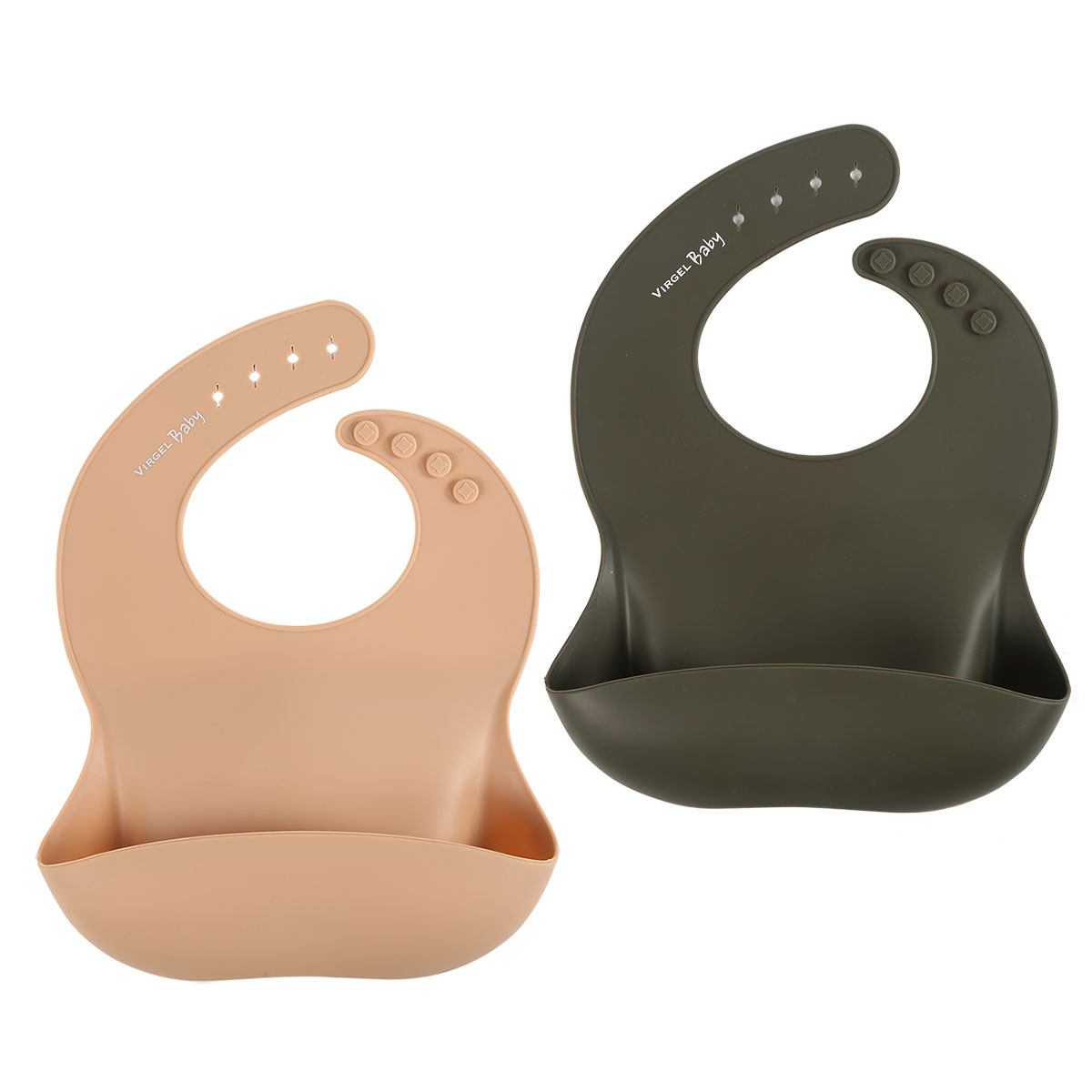 2-pack mjuka och följsamma silikonhaklappar. De har en ficka som samlar upp det som hamnar utanför och den är tillräckligt stor så att spillet ligger kvar även om barnet rör sig. Halsmåttet är ställbart i fyra lägen och storleken passar barn från ca 6 månader och upp till ca 3 år.