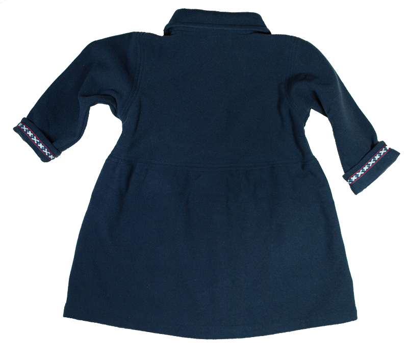 En fin kappa av mjuk och skön ullfleece i 100% merinoull. Detta är en skön finkappa vår och höst. Den har krage och knappar fram och ärmen kan du reglera genom att vika upp eller ner den. När den är uppvikt ser du även ett vackert allmogeband av 100% ekologisk bomull. Även nedtill på insidan finns det fina allmogebandet som du ser när kappan är i rörelse. Mycket välsydd och fin kappa av hög kvalité.