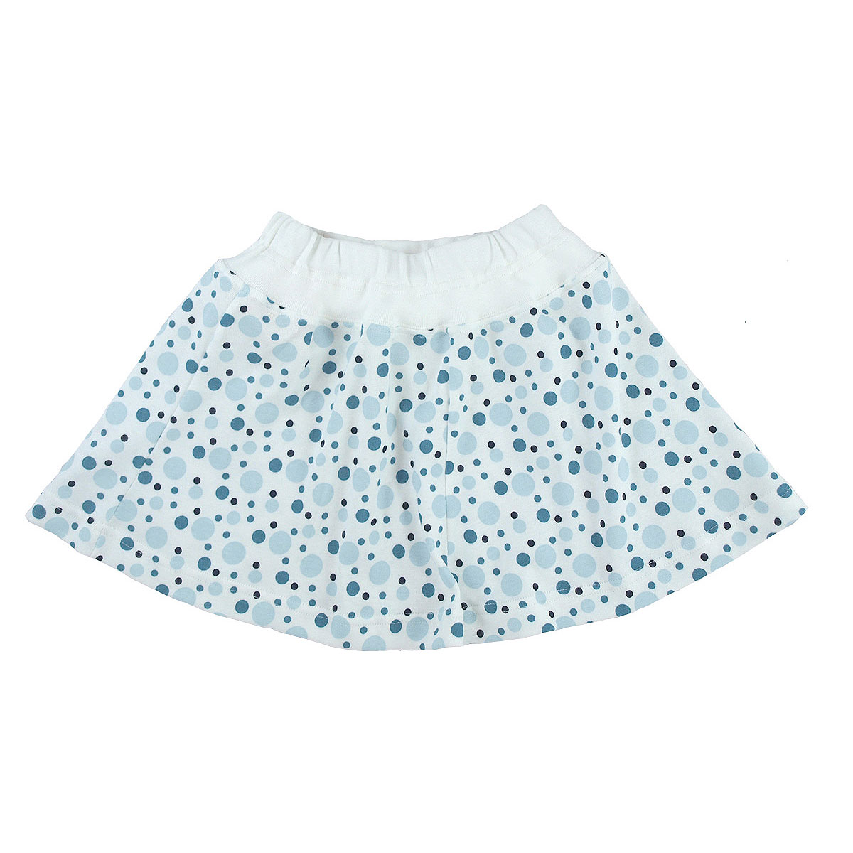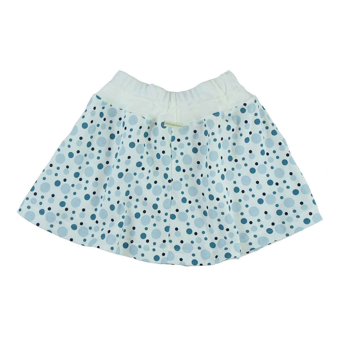 Mjuk och skön kjol i 100% ekologisk bomull, eco bubbles. Den har bred vit mudd upptill som är förstärkt med en mjuk resår. Mönstret är blå bubblor. Enkel modell utan onödiga sömmar och den ger gott om rörelsefrihet i leken. Platta, mjuka sömmar.