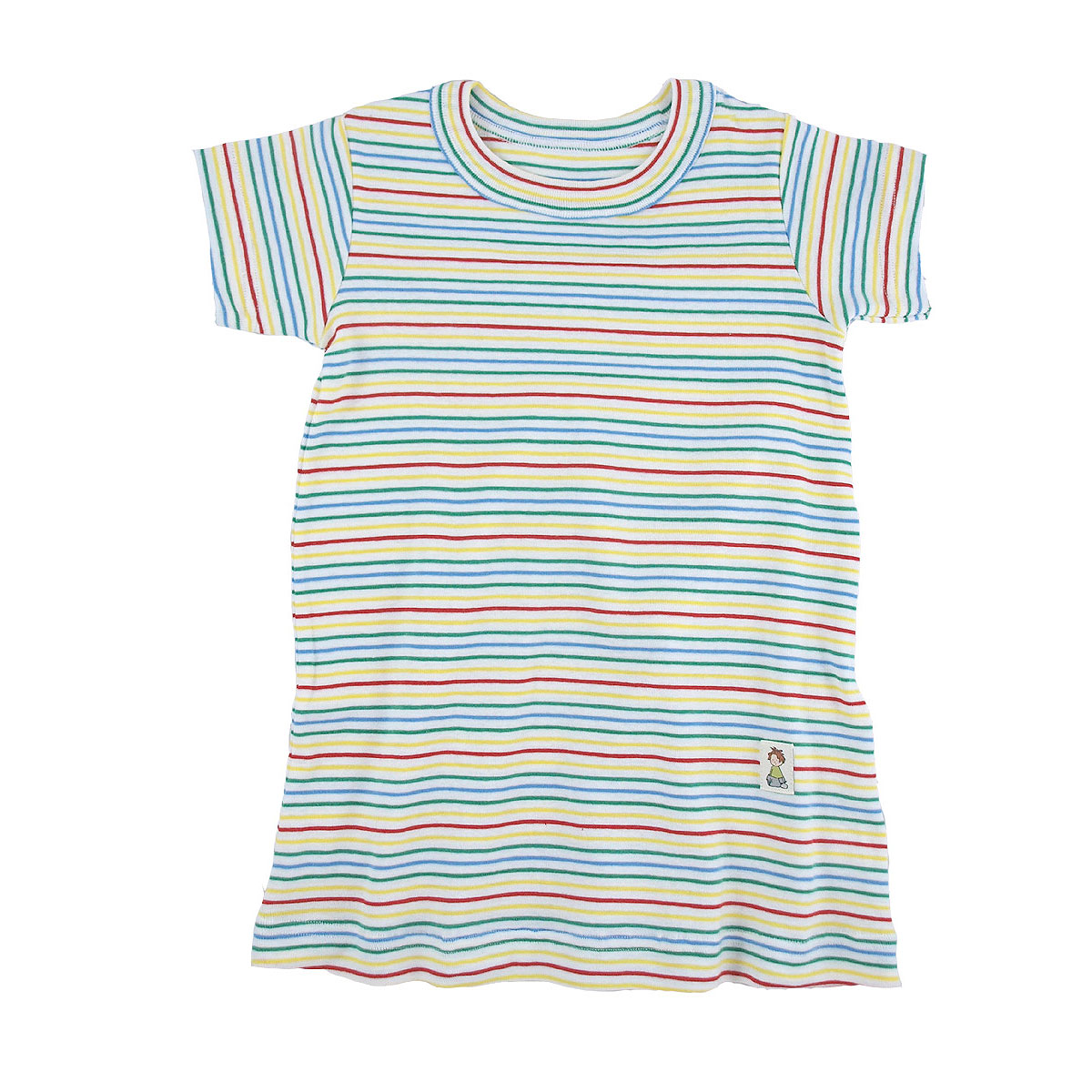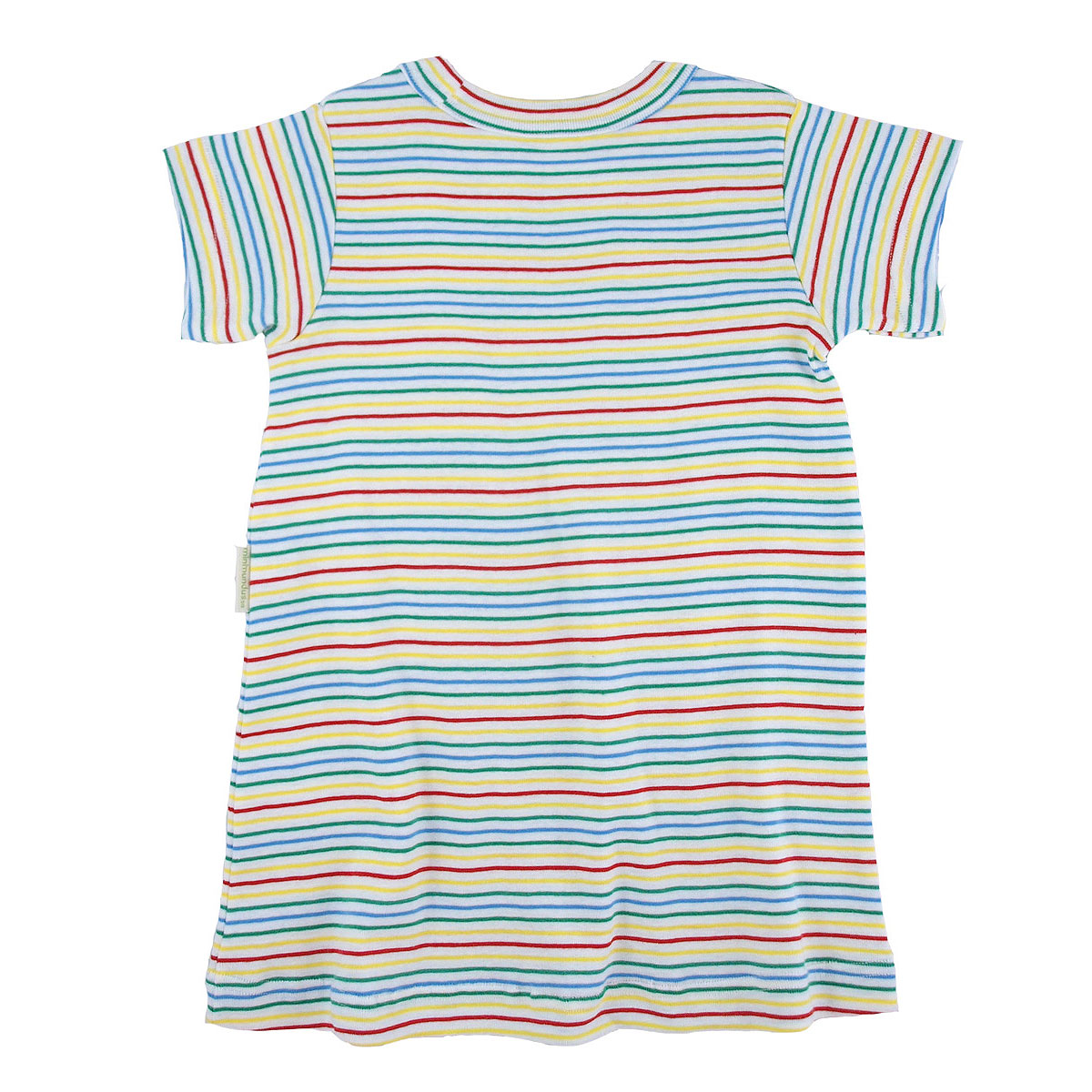 Mjuk och skön t-shirtklänning av 100% ekologisk bomull. Klänningen har kort ärm, rund hals och ränder i glada färger. Modellen utan många sömmar vilket ger gott om rörelsefrihet i leken. Platta, mjuka sömmar. Knyttmärke nedtill.