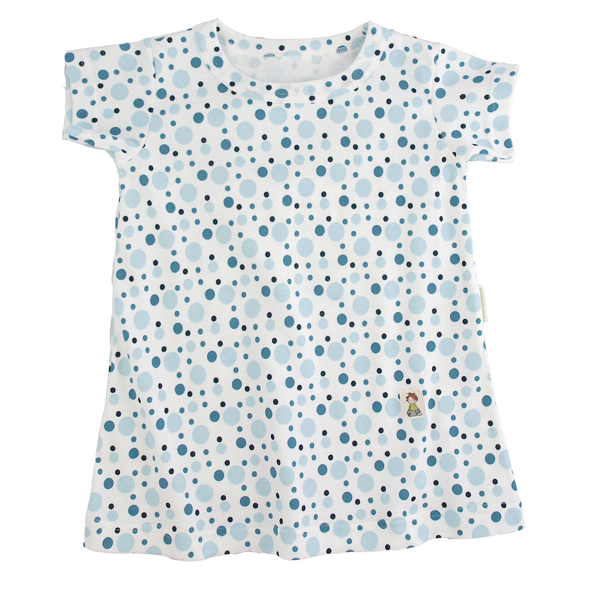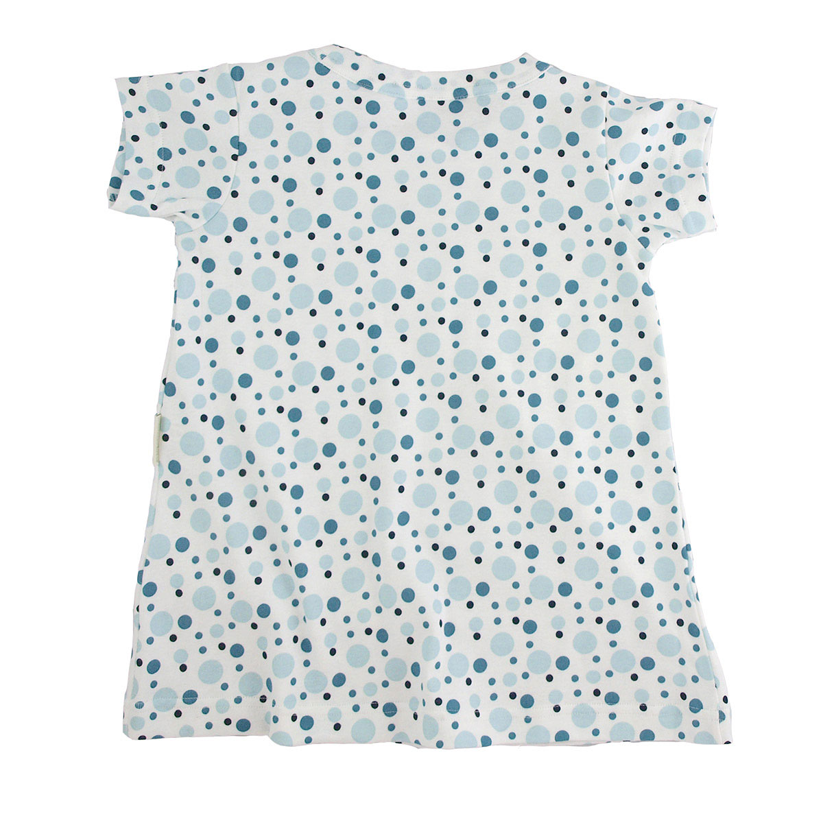 Mjuk och skön klänning av 100% ekologisk bomull, eco bubbles. Klänningen har kort ärm och rund hals. Roligt mönster med blå bubblor. Modellen är enkel utan onödiga sömmar vilket ger gott om rörelsefrihet i leken. Platta, mjuka sömmar. Knyttmärke nedtill.