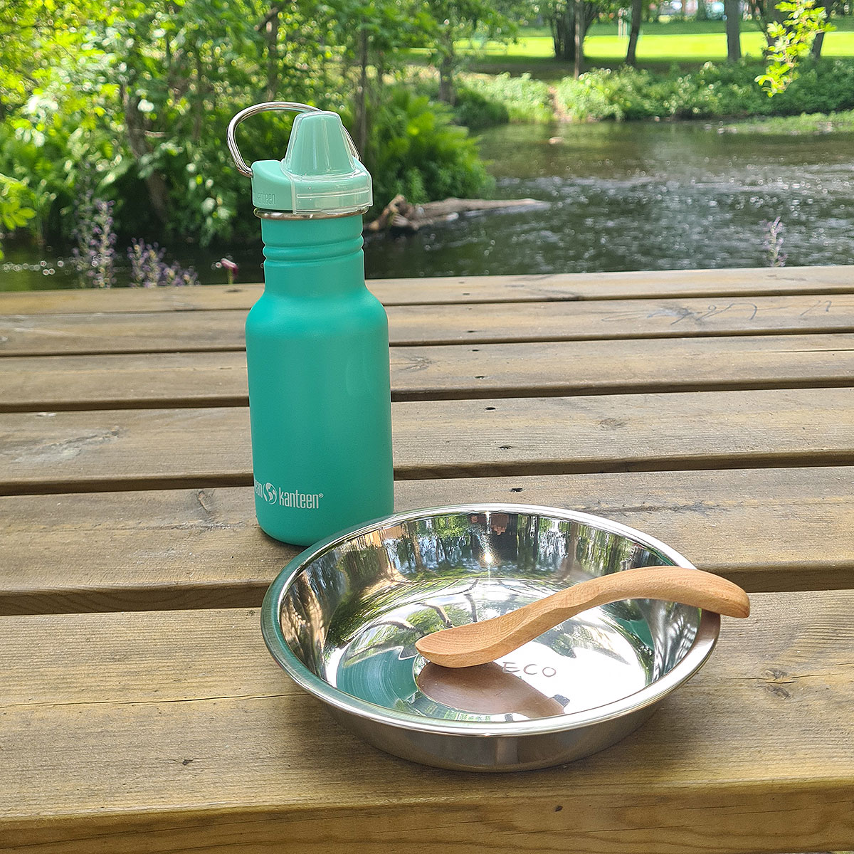 Hållbar och giftfri pipmugg för de allra minsta.  Vattenflaska av metall från Klean Kanteen i en fin ljusturkos färg. Den är perfekt att ta med på utflykten, i bilen, på stranden, lekplatsen eller använd den hemma.