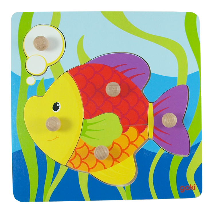 Favoritpussel för det lilla barnet. En enkel bild av en fisk skall pusslas ihop av 5 bitar. Lite svårare än att bara placera en bit på varje plats. Rejäla knoppar som är enkla att greppa.