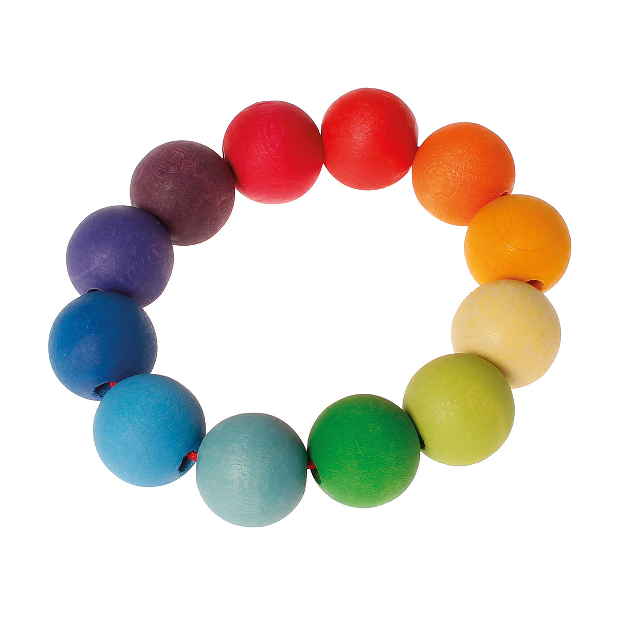En greppleksak som består av 12 st träkulor i regnbågens färger. Ringen av träkulor är perfekt att greppa, titta på och bita i. Sitter säkert på ett mycket kraftigt band i en ring.