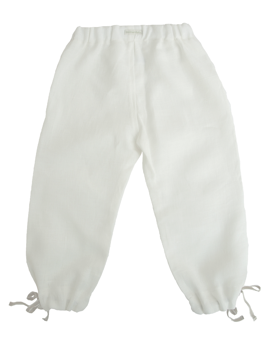 Långbyxor av 100% ekologiskt lin. Byxa av mjukt och följsamt linnetyg med vacker struktur och mycket vackert fall. Linbyxan har knytband nedtill som gör att de sitter bra ovanför foten och räcker länge. Byxan har bred, bekväm resår i midjan. Fina linnebyxor som passar till sommarens fester och de är även ett luftigt och lätt skydd mot solen.