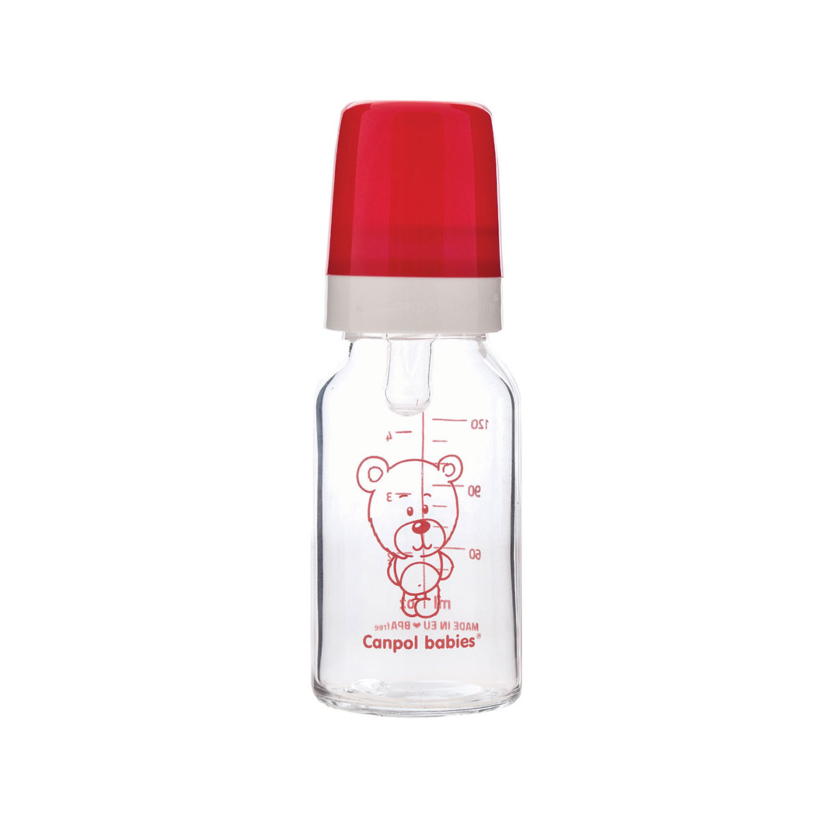 Canpol nappflaska av hållbart, värmetåligt borosilikatglas som är helt helt fritt från bl a Bisfenol A, B och S och ftalater. Nappflaskan tål att diskas i maskin och värmas i mikron. Med nappflaskan följer en napp av silikon från ca 3 mån, nappring, förseglingsbricka och skyddslock samt skötselanvisning på svenska. Andra flasknappar av modellen ”regular” eller ”narrow neck”passar till flaskan. Trevligt nallemotiv i rött och rött skyddslock. Napphållaren, förseglingsbrickan och nappskyddet är vita.