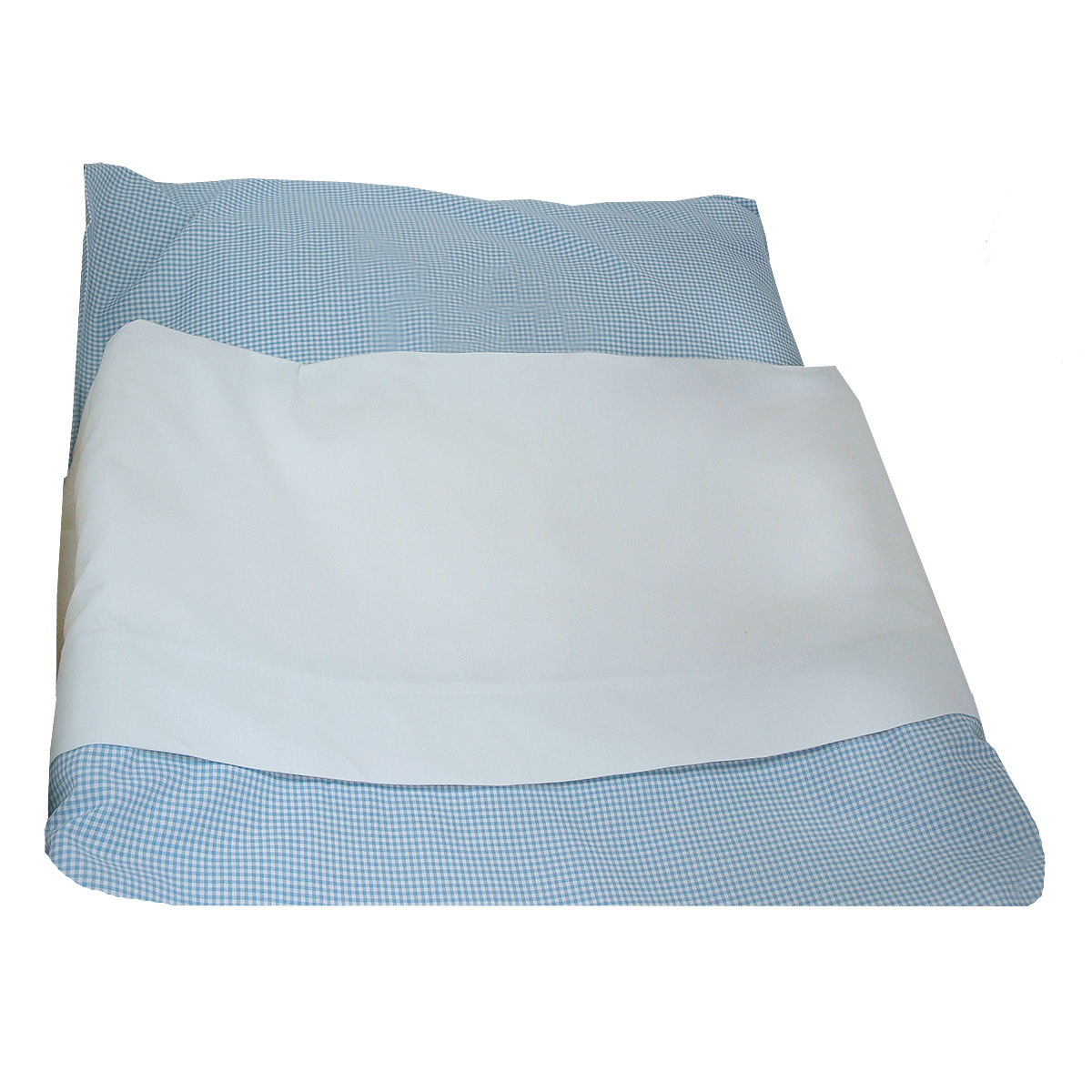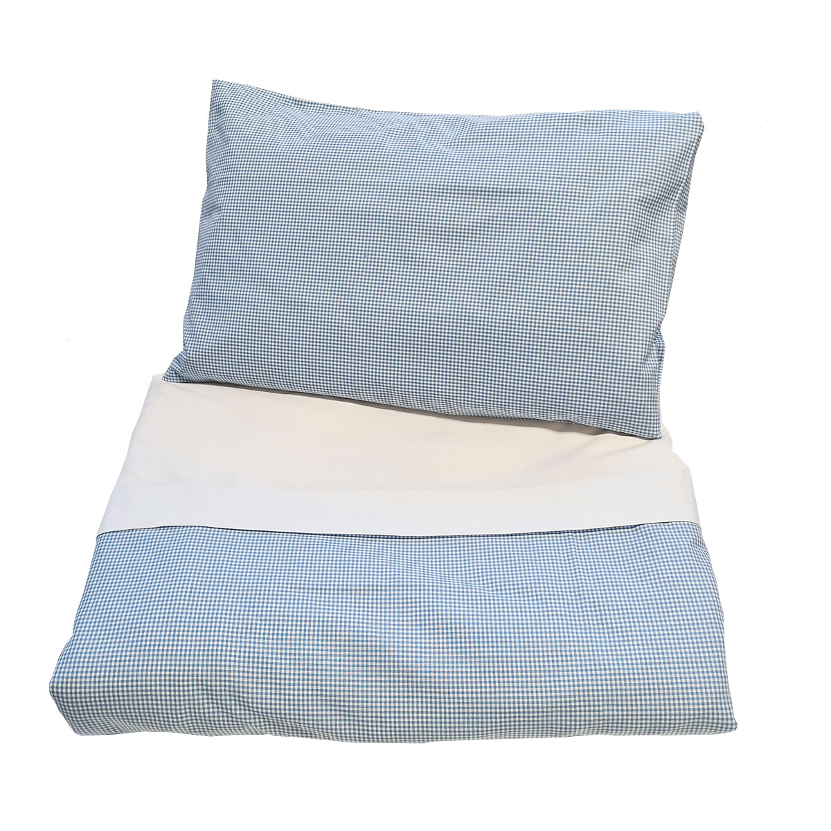 Ekologiskt påslakanset till spjälsängen. Påslakanet är rutigt i ljusblått och vitt på ovansidan med ett vitt övervik och vitt på undersidan. Öppning vid fotändan. Örngottet är rutigt i ljusblått och vitt och öppnas i sidan.