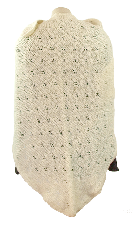 Grovt stickad sjal. Av naturbetesull från Färöarna. Sjalen är triangelformad och har ett vackert hålmönster. Den kan användas som sjal eller yllefilt i vagnen eller babysängen. Den är tillräckligt stor så att den värmer både dig och barnet när du bär det i bärsjal/bärsele.