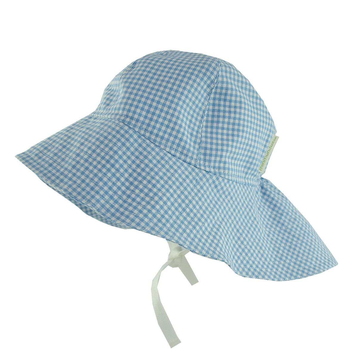 Solhatt av ljusblårutig ekobomull. Lite längre brätte där bak för att skydda nacken. Mjuk och skön 100% ekologisk bomull. Knytband