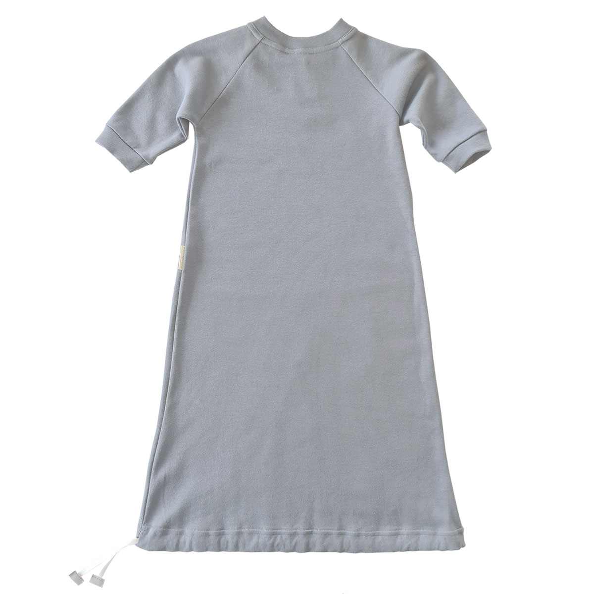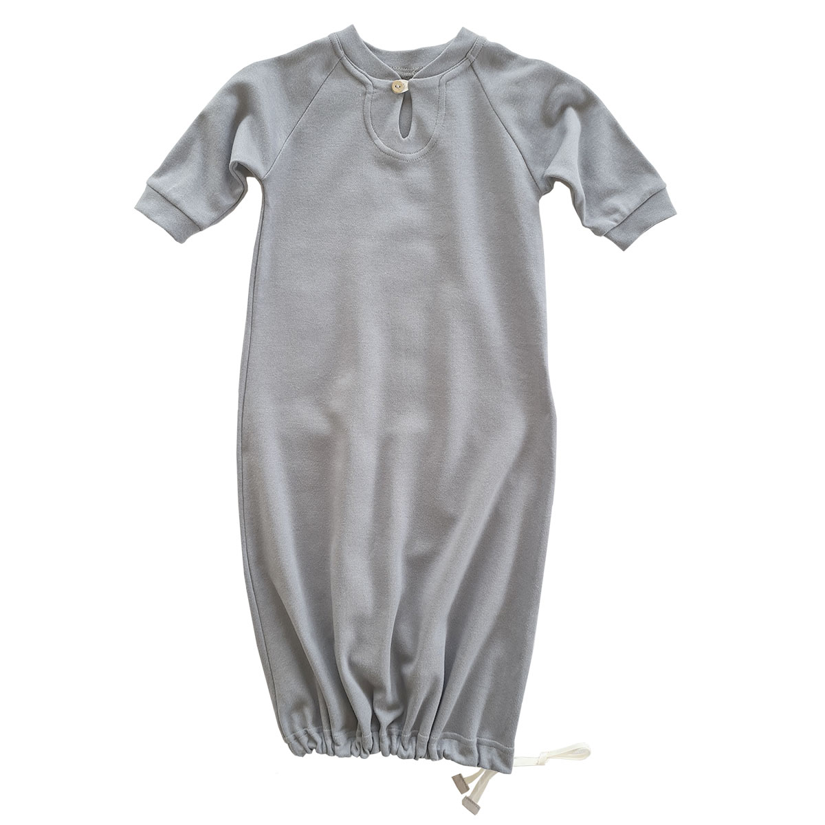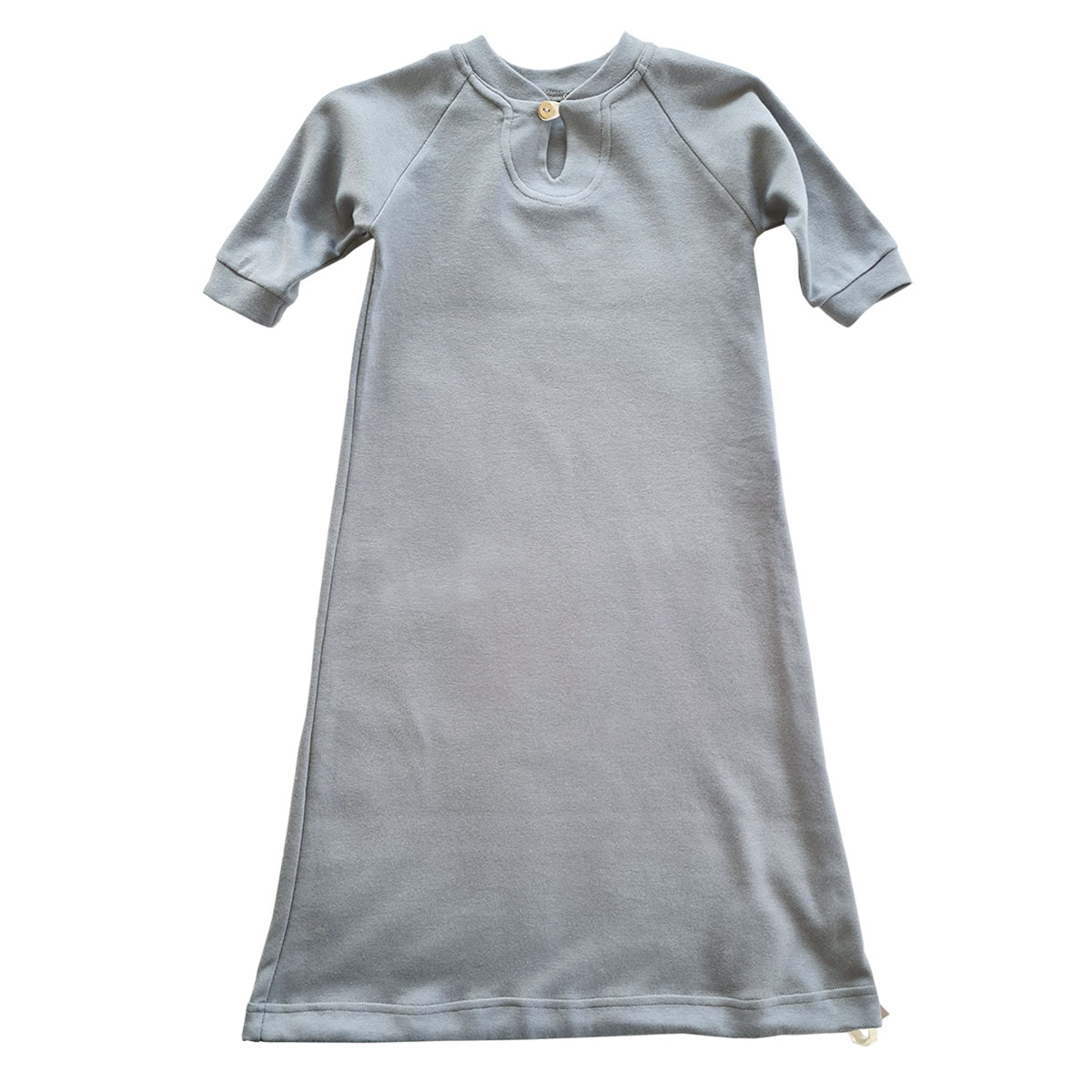 Sovpåsen är mjuk och skön och materialet är 100% ekologisk bomull. Modellen är skön med rymlig raglanärm och framtill knäpper du den med en knapp av kokosskal.