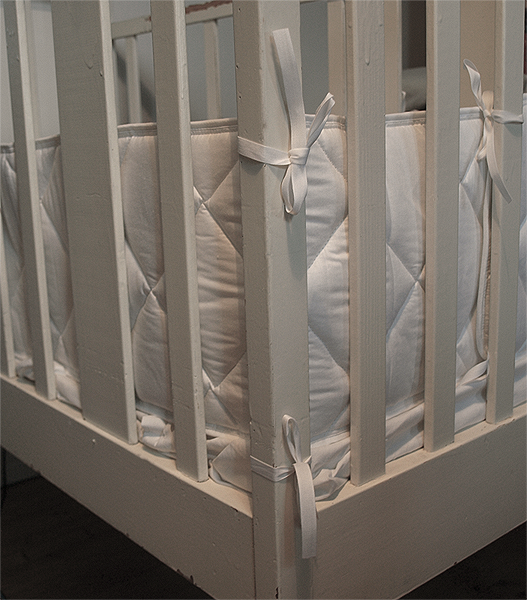 Fräsch vitt spjälskydd. Utsida av ekologisk bomull, kärna av polyesterfiber. Vackert quiltat i kvadrater. Knyts fast med vita bomullsband upptill och nedtill. 7 knytband i överkanten och 7 knytband i underkanten. Godkänt enligt ÖKO-Tex 100, klass 1 för baby.