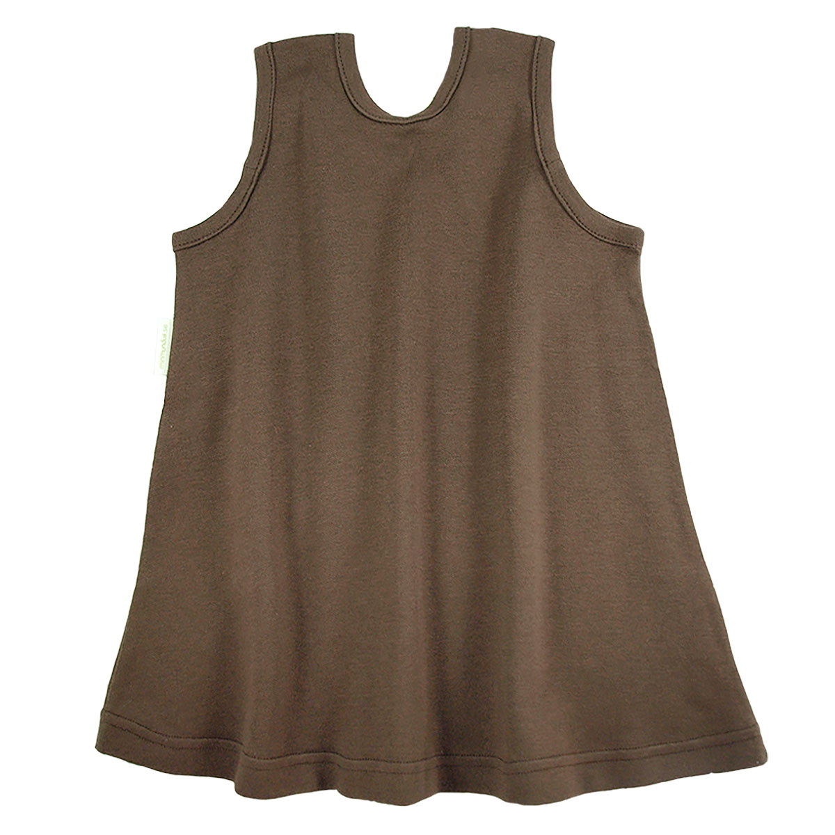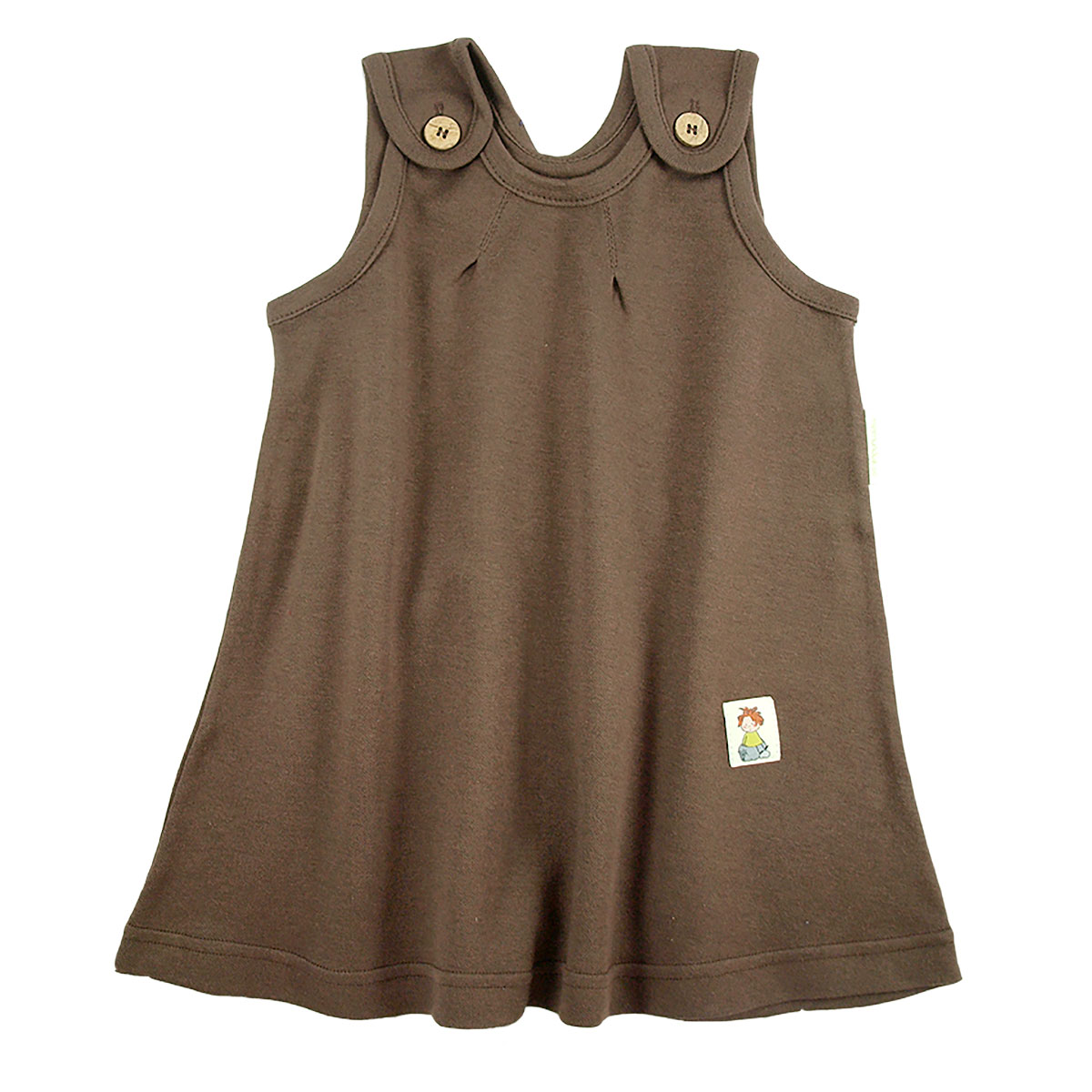 En enkel hängselklänning med vidd och lekutrymme. Du knäpper den med en fin knapp av kokos på axeln. Den har rund halsringning och två veck fram som ger ett fint fall.