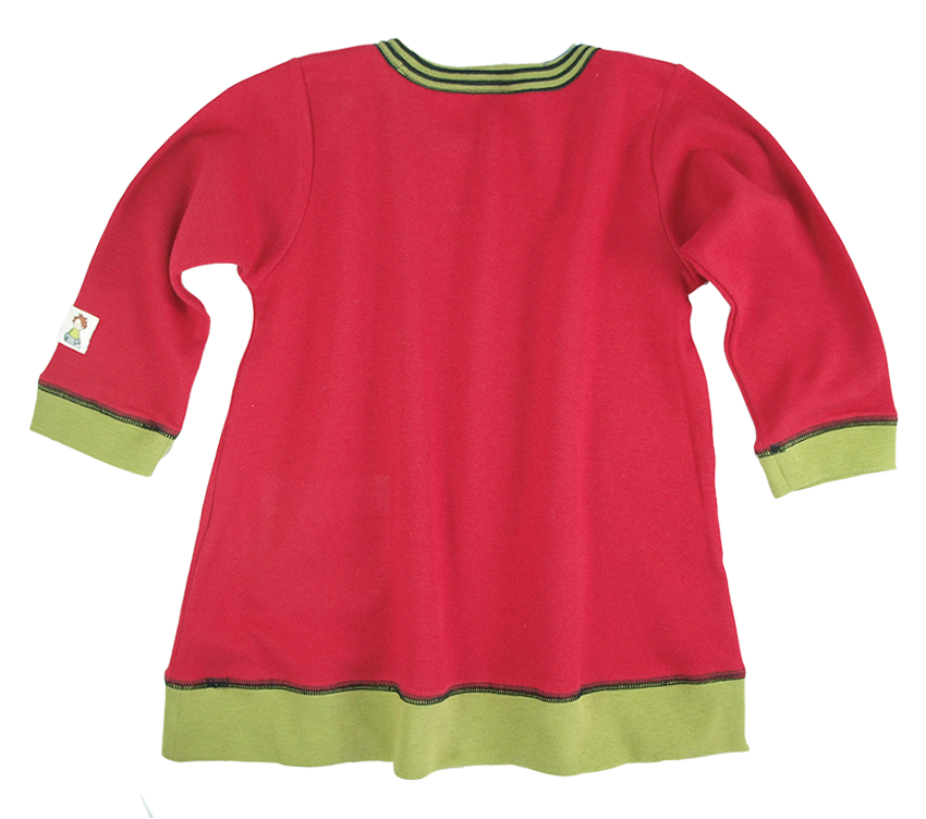 Mjuk och skön klänning/tunika med lång ärm. Gröna detaljer nedtill, i halsen och vid ärmslut. Liten röd/svartrandig ficka. Utsvängd nedtill ger bra passform och inte hindra i yviga lekar. Rund hals. Användbar modell som passar tillsammans med leggings av bomullstrikå eller Janus sköna strumpbyxor av ull. Modellen för tankarna till Pippi Långstrump tänker vi. Knyttmärke