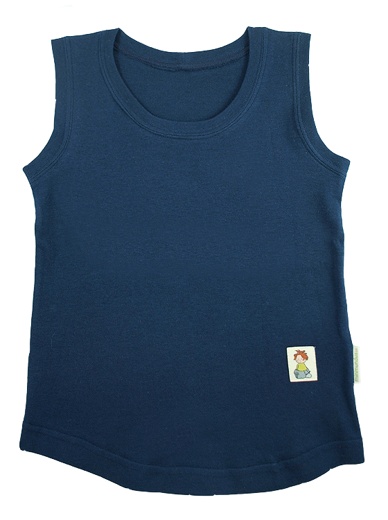 Skönt linne för varma dagar. Mjuk kant i hals och ärmhål. Rundat i nederkanten, längre fram och bak för bästa komfort och passform.För att inte magen skall bli bar när barnet rör sig mycket. Knyttmärke.