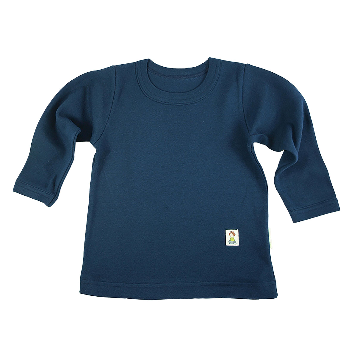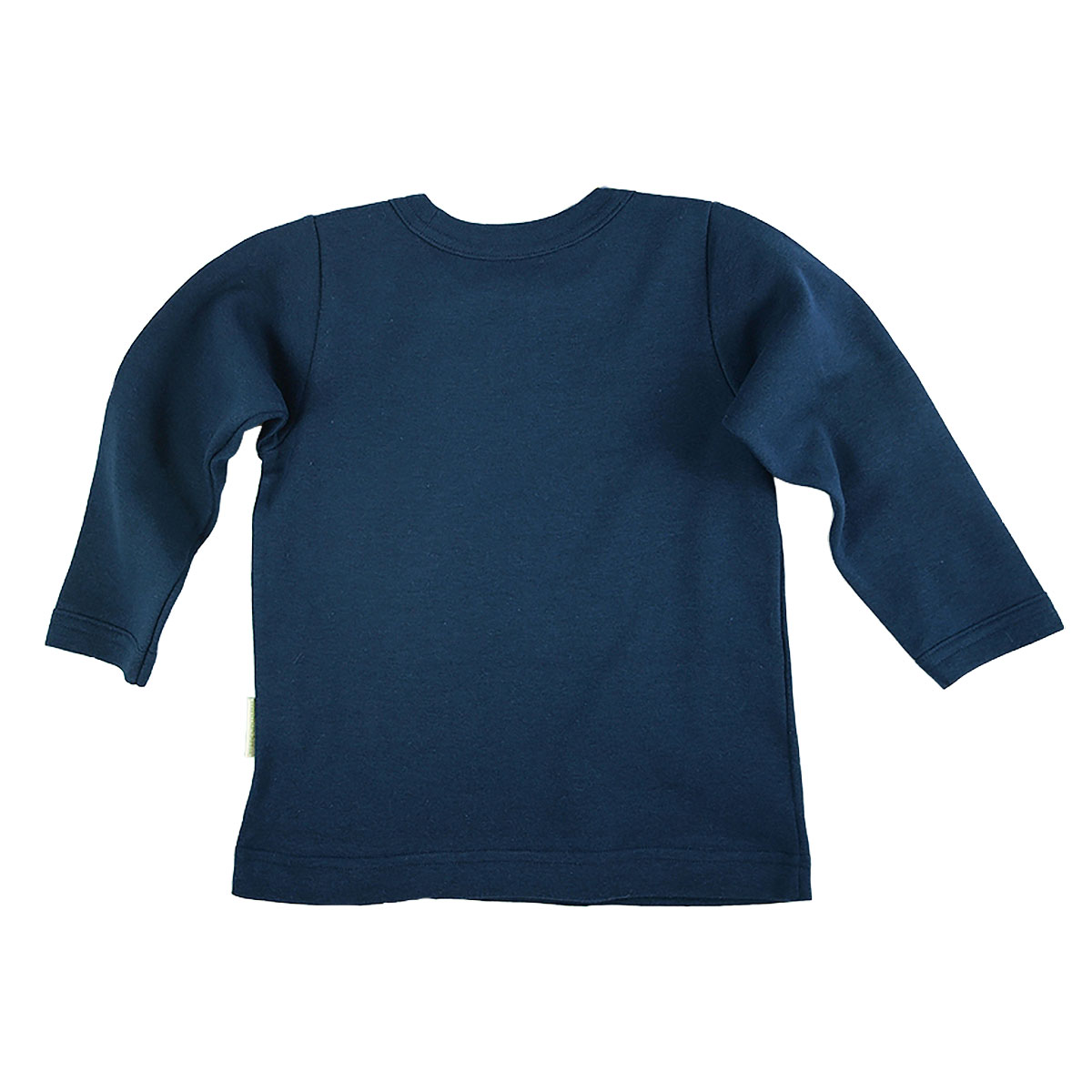 Tröja med lång ärm med rund hals och rakt ärm utan mudd. Tilltagen längd så att den inte lämnar midjan bar. Den har ett litet knyttmärke.