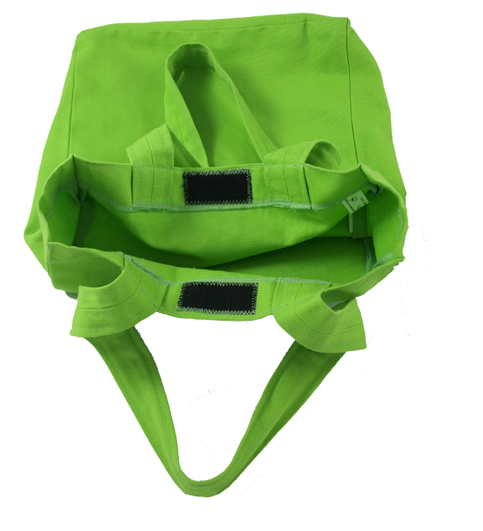 En rejäl tygkasse som rymmer lite av varje. Av kraftig ekologisk bomull. Kardborrlås. Härligt grön. Kraftiga handtag i precis rätt storlek för att den skall kunna bäras över axeln eller i handen. Sydd så att det bildas en botten.